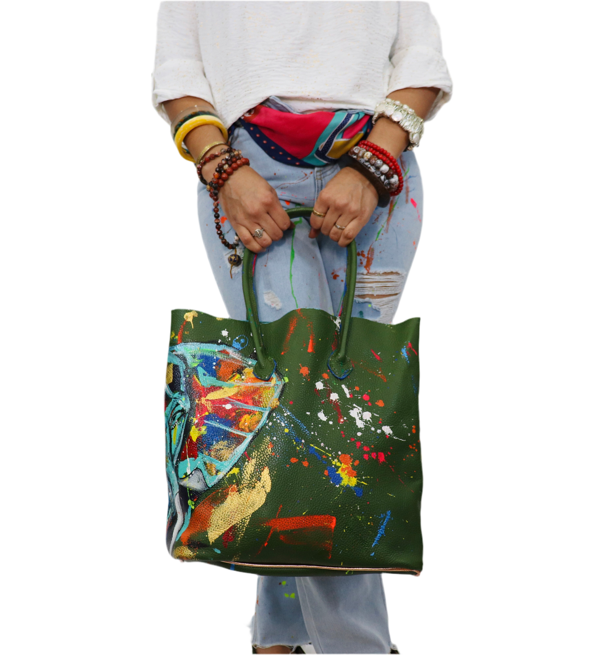 Express your strength and embrace your heritage with the Green Elephant Bucket Tote, an original work of art by Alexander Boyce. This luxury handbag features a powerful hand-painted African Elephant on sumptuous metallic gold leather, blending high-end craftsmanship with cultural storytelling. More than an accessory, it’s a bold statement of individuality, Black excellence, and ancestral pride—a must-have for the modern woman who values art, heritage, and exclusivity.